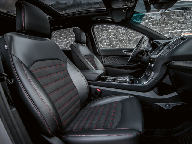 The top-of-the-line sport model is the 2022 Ford Edge ST. Like the Titanium, it has the 10-way power bucket seats. Accent colors include a Turous front console and city silver stitching on the perforated leather steering wheel. The seats combine a luscious leather with Miko inserts.