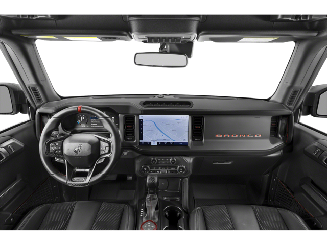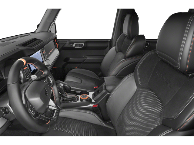 New Ford Bronco Raptors have a distinct interior from its laser-perforated suede upholstery to its available orange seatbelts. Leather-clad front-seat bolsters complement the Black Onyx Neo inserts. Other elements include the soft-vinyl dashboard and sport-contour steering wheel.