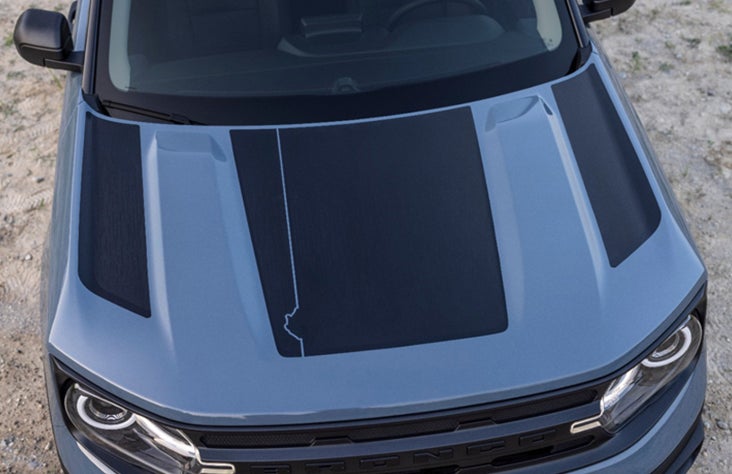 In stripes of reflective color, red orange and yellow graphics form a rainbow down the sides of the Bronco Sport Free Wheeling Special Edition. There’s more color on the hood and liftgate, bringing the look together.