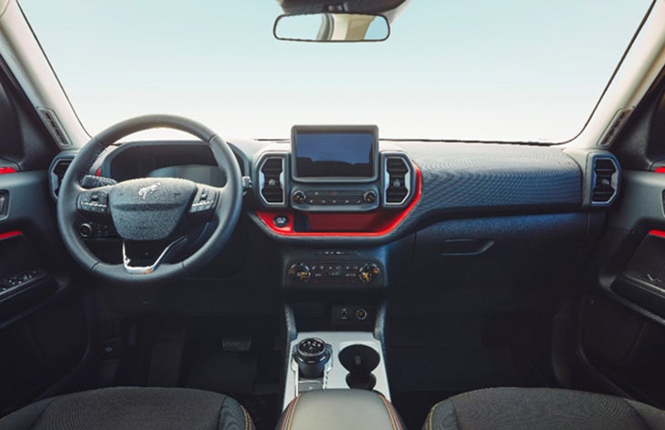 Inside there are Sport Contour seats to hug you on curves and keep you cushioned over bumps. A black bucking Bronco badge dresses up the modified air bag cover. When the gauge cluster comes to life, the graphics reveal the Milky Way on the start-up screen.